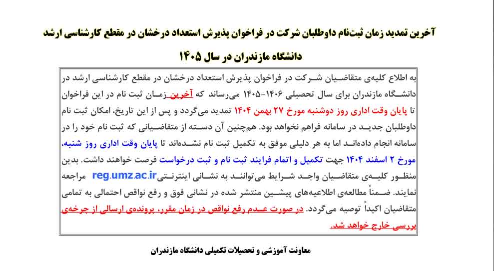 آخرین تمدید زمان ثبتنام داوطلبان شرکت در فراخوان پذیرش استعداد درخشان در مقطع کارشناسی ارشد دانشگاه مازندران در سال 1405