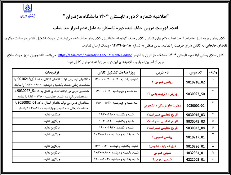 اطلاعيه شماره 6 درخصوص کلاسهای حذف شده دوره تابستان و آدرس کانال ایتایی دوره تابستان دانشگاه مازندران