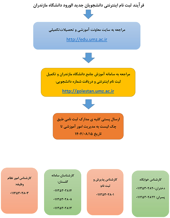 اطلاعیه شماره 4 درخصوص فلوچارت ثبت نام و شماره تماس های ضروری دانشگاه ویژه پذیرفته شدگان نو ورود سال تحصیلی 1404 دانشگاه مازندران - دانشگاه مازندران