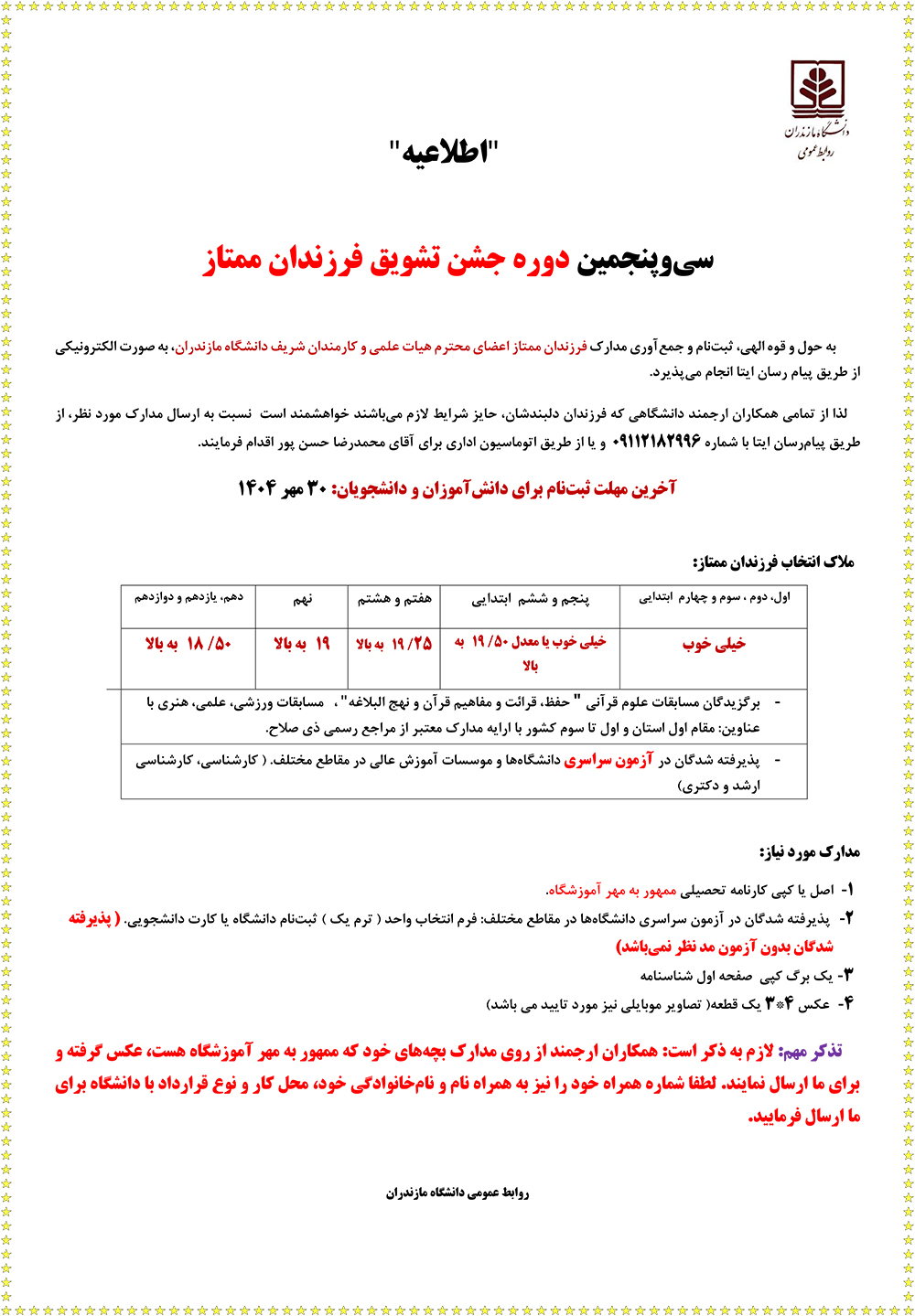 اعلام زمان دریافت مدارک به مناسبت سیوپنجمین دوره جشن تشویق فرزندان ممتاز - دانشگاه مازندران