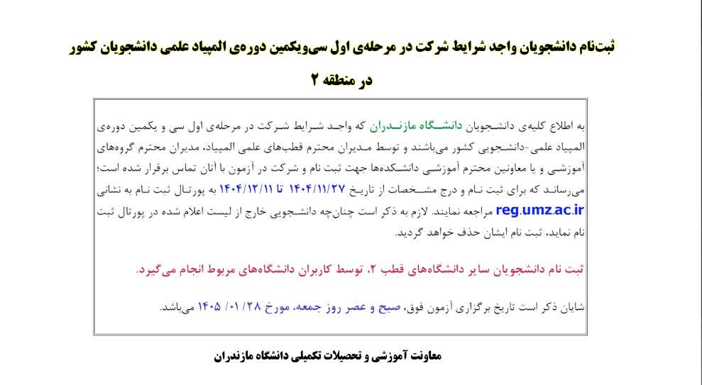 ثبتنام دانشجویان واجد شرایط شرکت در مرحلهی اول سیویکمین دورهی المپیاد علمی دانشجویان کشور در منطقه 2 - دانشگاه مازندران